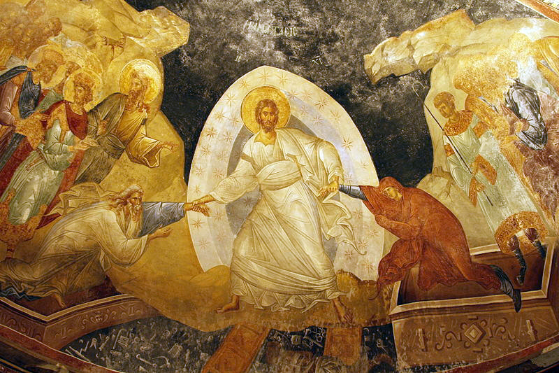 The Lord approached them bearing the Cross, the weapon that had won him the victory. At the sight of him Adam, the first man he had created, struck his breast in terror and cried out to everyone: ‘My Lord be with you all’. Christ answered him: ‘And with your spirit’. He took him by the hand and raised him up, saying: ‘Awake, O sleeper, and rise from the dead, and Christ will give you light’.