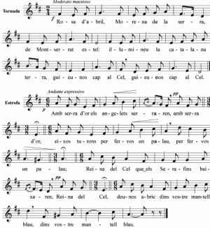 Feast Day: 27 AprilRosa d’abril, Morena de la serra,de Montserrat estel, il·lumineu la catalana terra, guieu-nos cap al Cel. Amb serra d’or els angelets serraren eixos turons per fer-vos un palau; Reina del Cel que els Serafins baixaren, deu-nos abric dins vostre mantell blau. Alba naixent d’estrelles coronada, Ciutat de Déu que somnià David, a vostres peus la lluna s’és posada, el sol sos raigs vos dóna per vestit. Dels catalans sempre sereu Princesa, dels espanyols Estrella d’Orient, sigueu pels bons pilar de fortalesa, pels pecadors el port de salvament. Doneu consol a qui la pàtria enyora, sens veure mai els cims de Montserrat; en terra i mar oïu a qui us implora, torneu a Déu els cors que l’han deixat. Mística Font de l’aigua de la vida, rageu del Cel al cor de mon país; dons i virtuts deixeu-li per florida; feu-ne, si us plau, el vostre paradís. Ditxosos ulls, Maria, els que us vegin! ditxós el cor que s’obri a vostra llum! Roser del Cel, que els serafins voltegen, a ma oració doneu vostre perfum. Cedre gentil, del Líbano corona, Arbre d’encens, Palmera de Sion, el fruit sagrat que vostre amor ens dóna és Jesucrist, el Redemptor del món. Amb vostre nom comença nostra història i és Montserrat el nostre Sinaí: sient per tots l’escala de la glòria eixos penyals coberts de romaní. Rosa d’abril, Morena de la serra, de Montserrat estel, il·lumineu la catalana terra, guieu-nos cap al Cel.